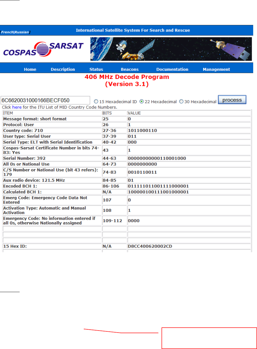 Input the 22-digit hex code into the 406 MHz Decode Program provided. See below: